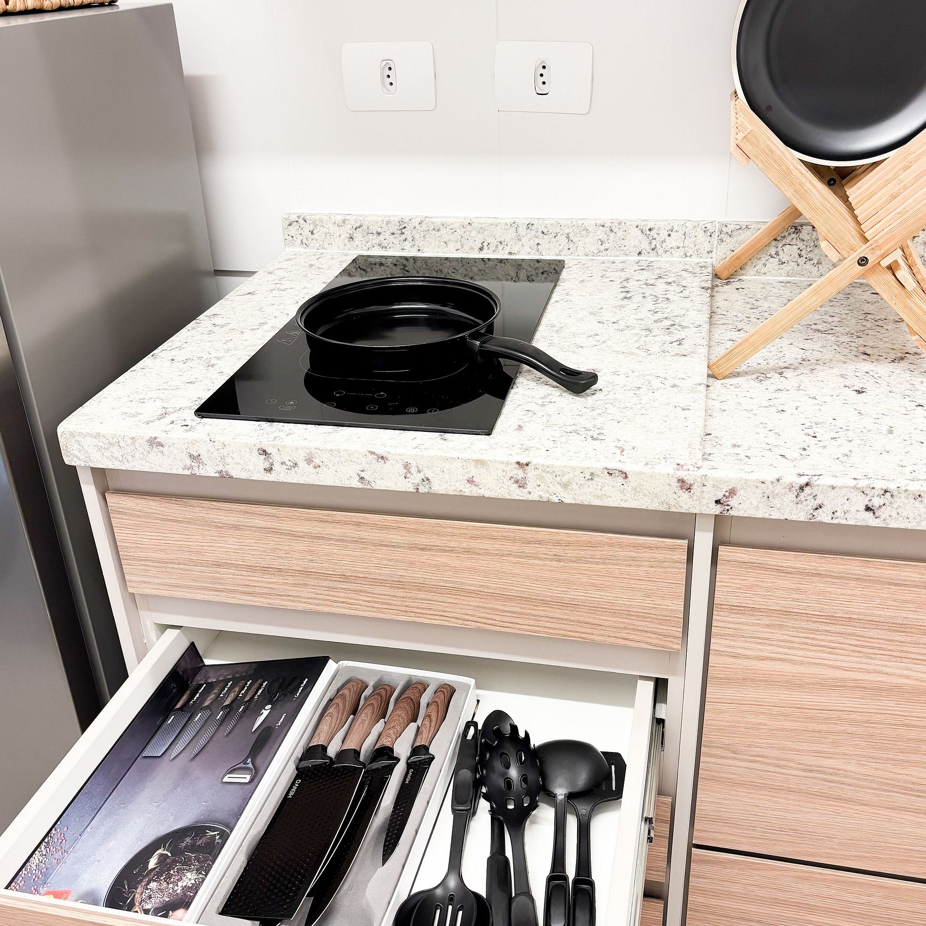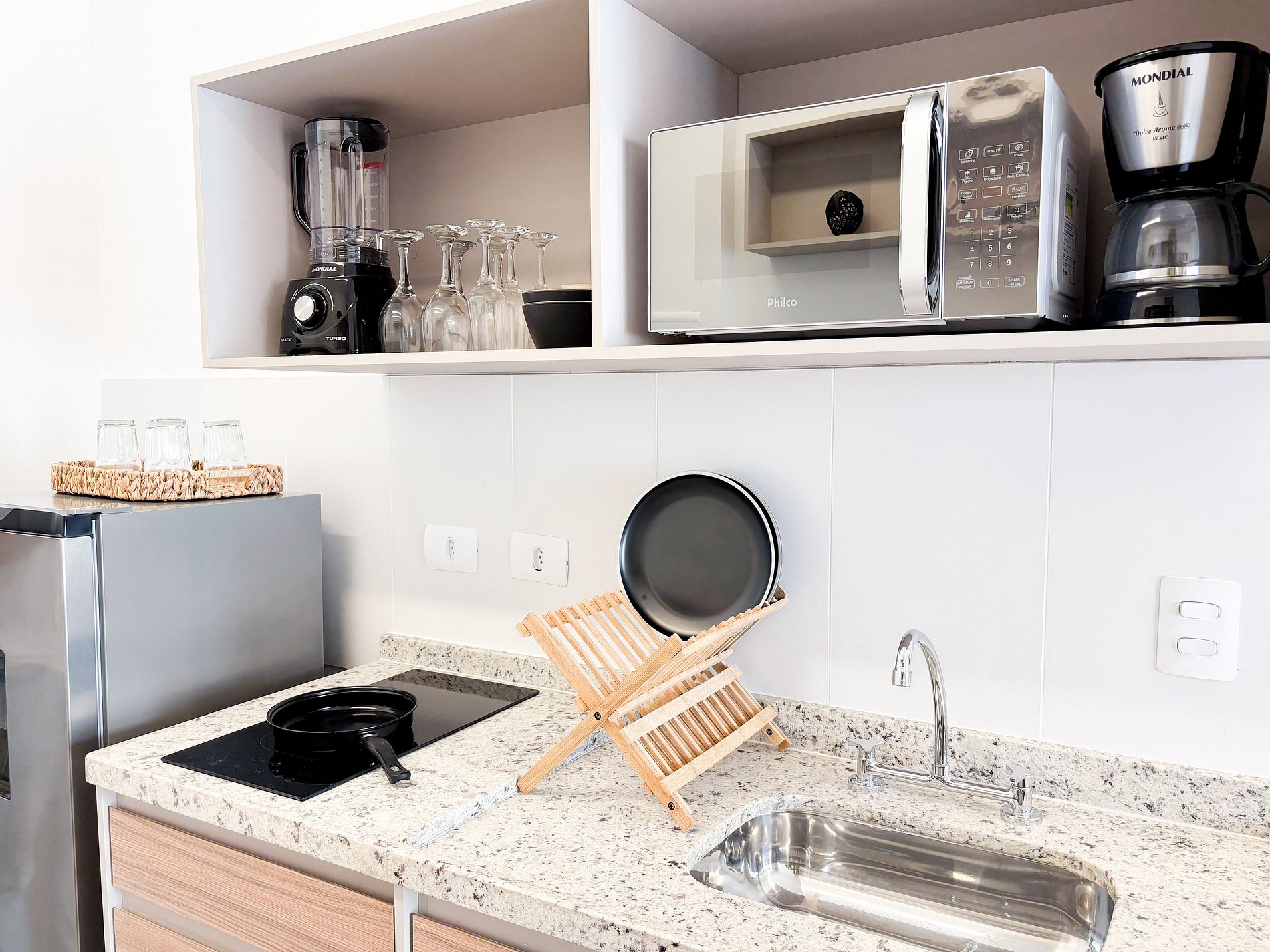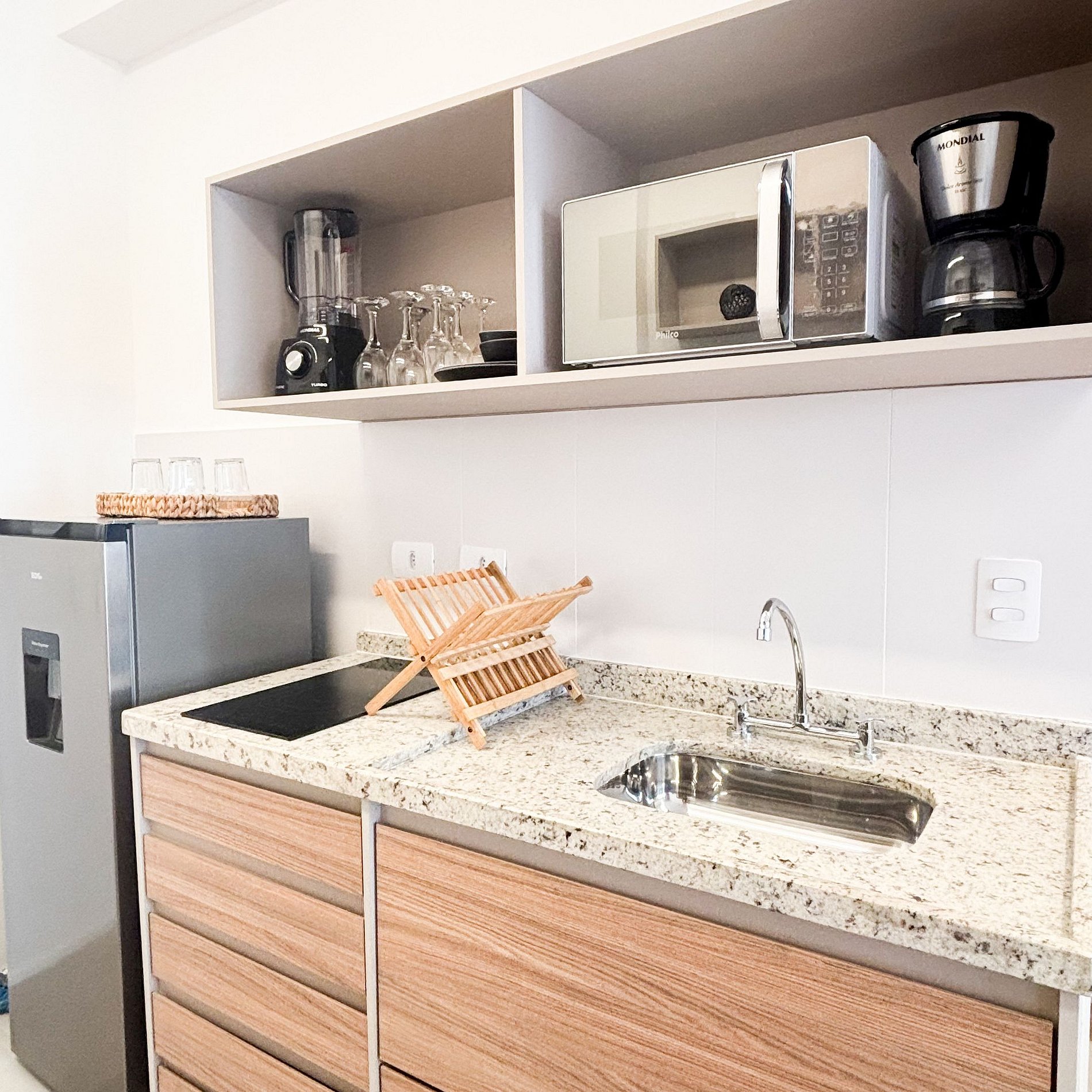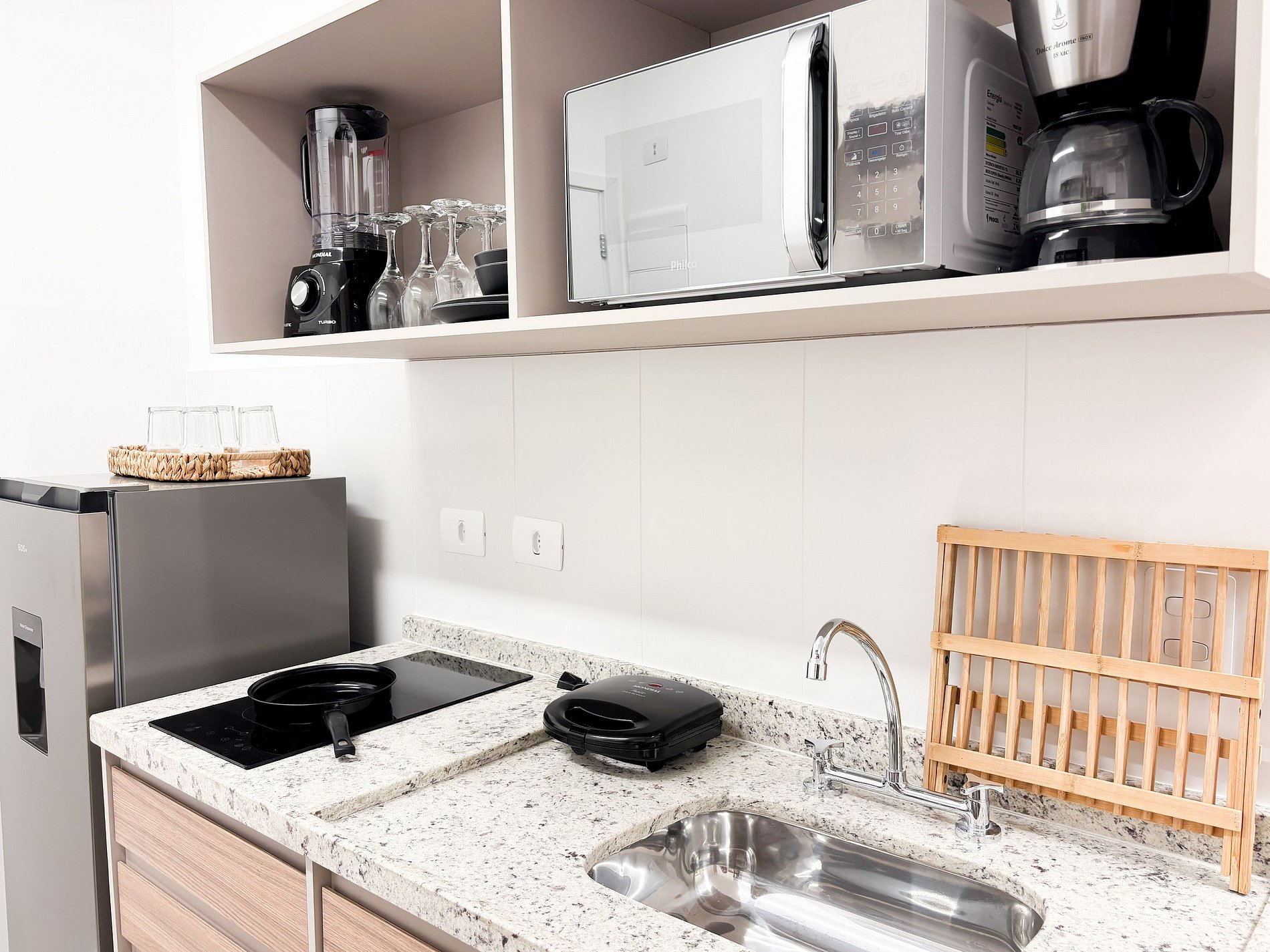 * Cozinha compacta totalmente equipada com cooktop, micro-ondas, cafeteira e todos os utensílios necessários