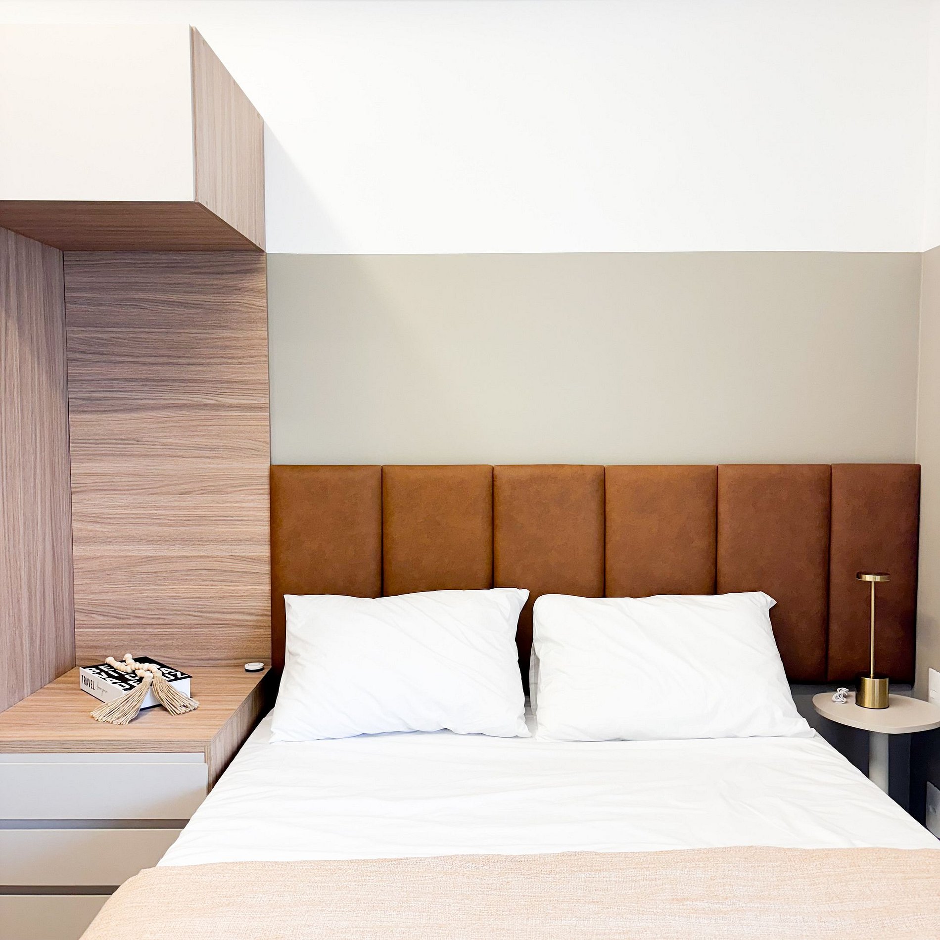 * Quarto aconchegante com cama de casal confortável, cabeceira estofada e iluminação de LED que cria um ambiente relaxante